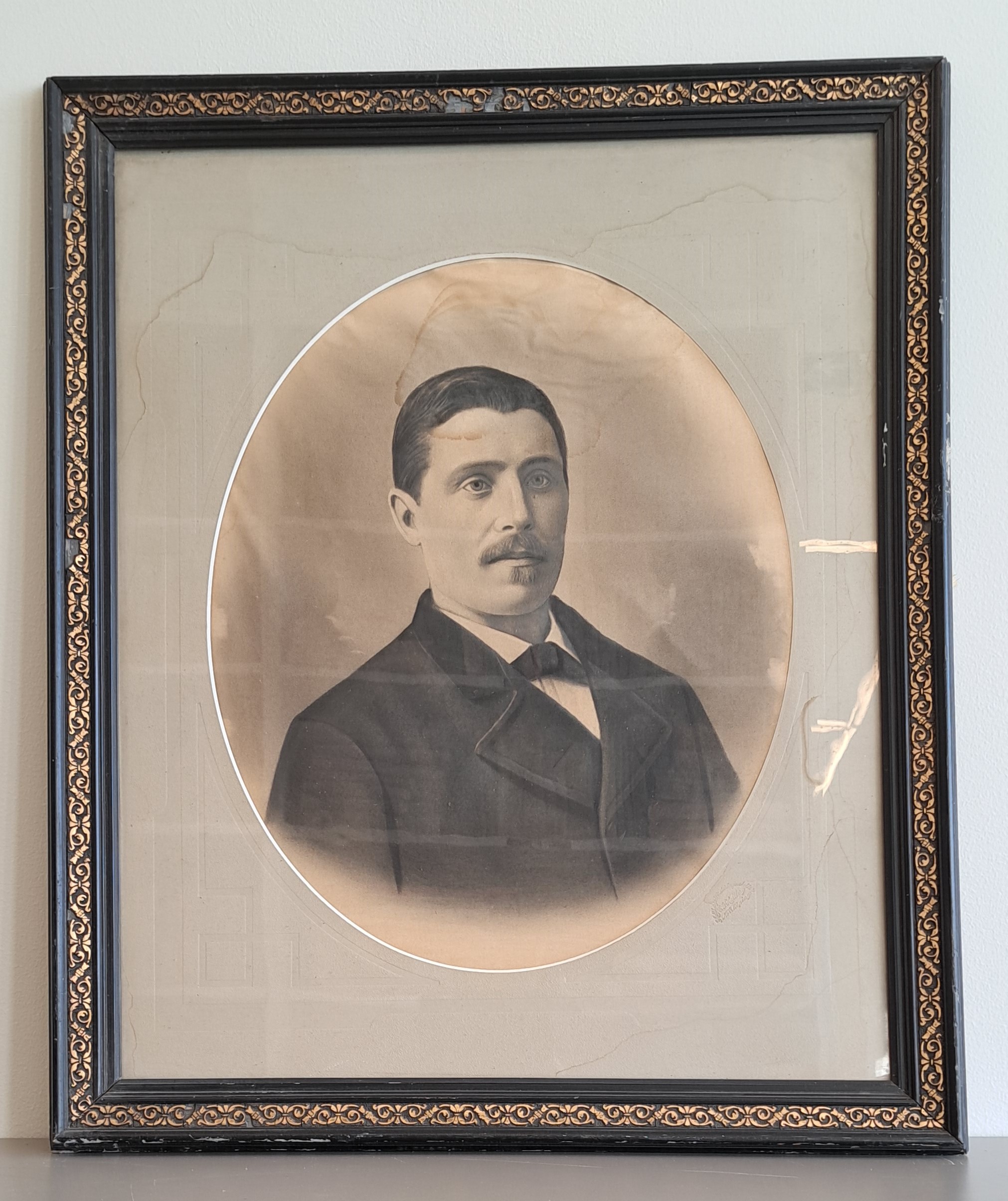 Kehystetty valokuvasuurennos, kuvassa kauppalaivuri Samuel Henriksson. Mustat kehykset, joissa kullanvärisiä kuvioita.