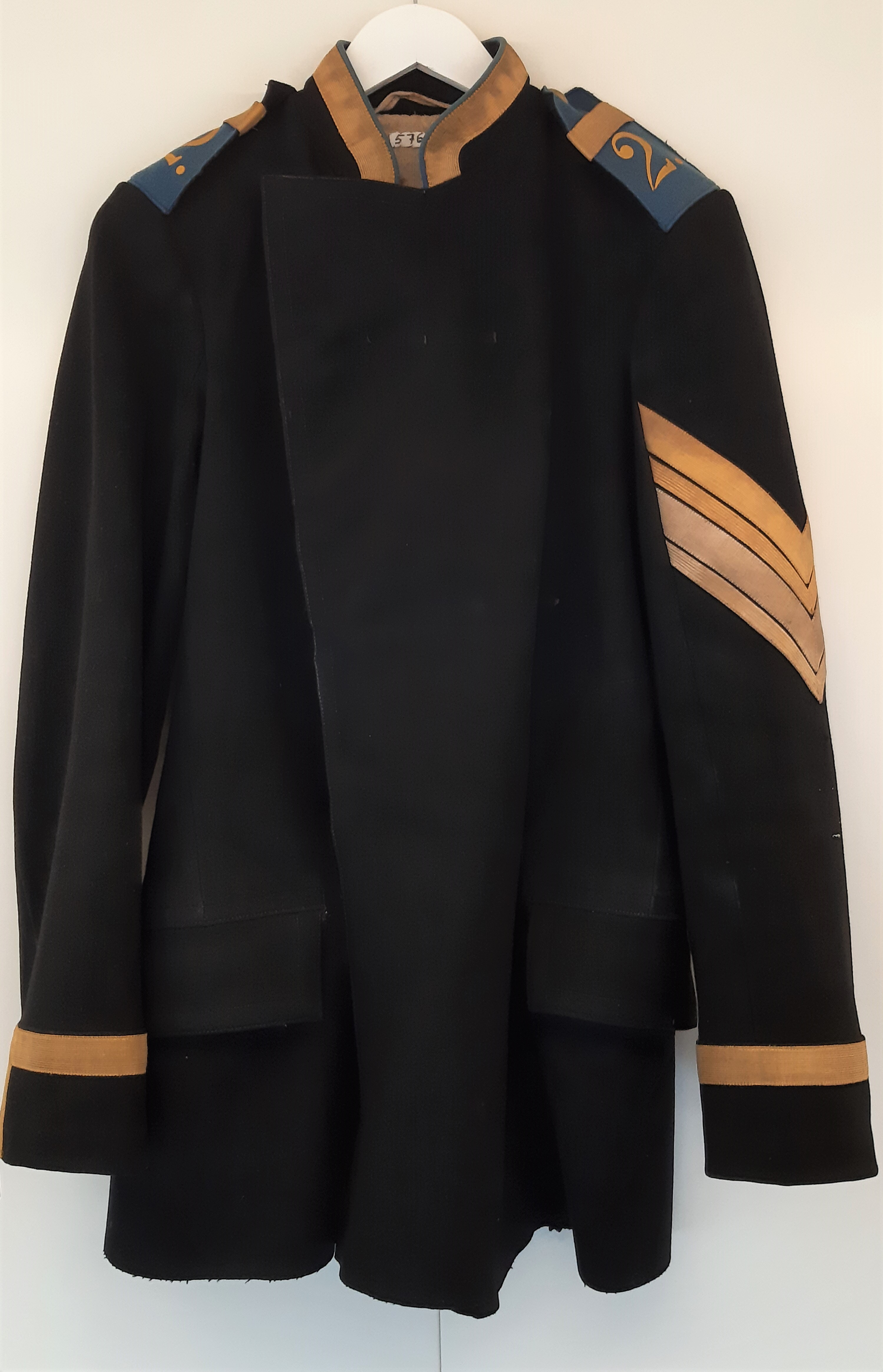 Musta sotilastakki. Miehen villakankainen takki. Taskuissa läpät, pystykaulus, jossa kullanväristä koristetta. Vasemmassa hihassa V-mallinen hihamerkki. Olkapäillä siniset epoletit, joissa numero 2. Vuori karheaa pellavakangasta. Epoletit, kullanvärinen kaulus, hihakoristeet. Hihan yläosan nauhat ovat palveluvuosinauhoja, joiden määrä kertoo palvelusvuosien määrän. Olkapään epoletin numero on keltainen, joka merkitsee, että kyseesä oli ns. aktiivipataljoona.