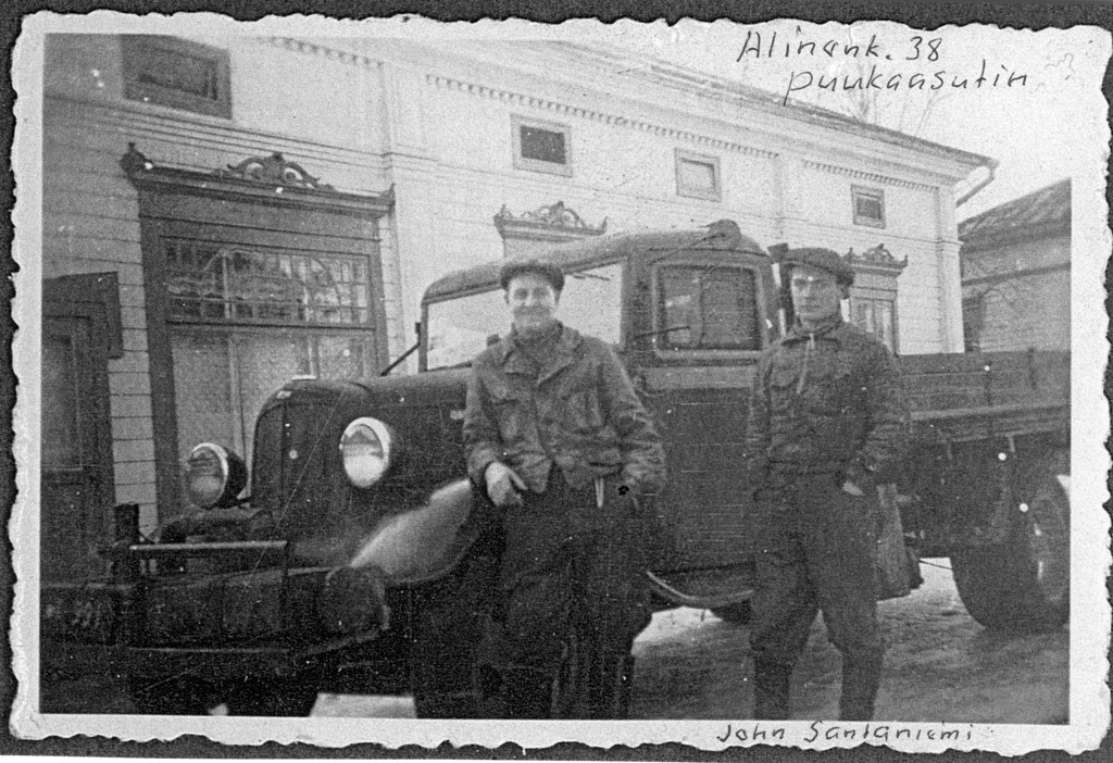 Asiakkaalta saatu tulostettuna kopiona. Kuorma-auto Alisellakadulla, autossa puukaasutin. Kaksi miestä seisoo auton vieressä, toinen John Santaniemi. Alinenkatu 38.