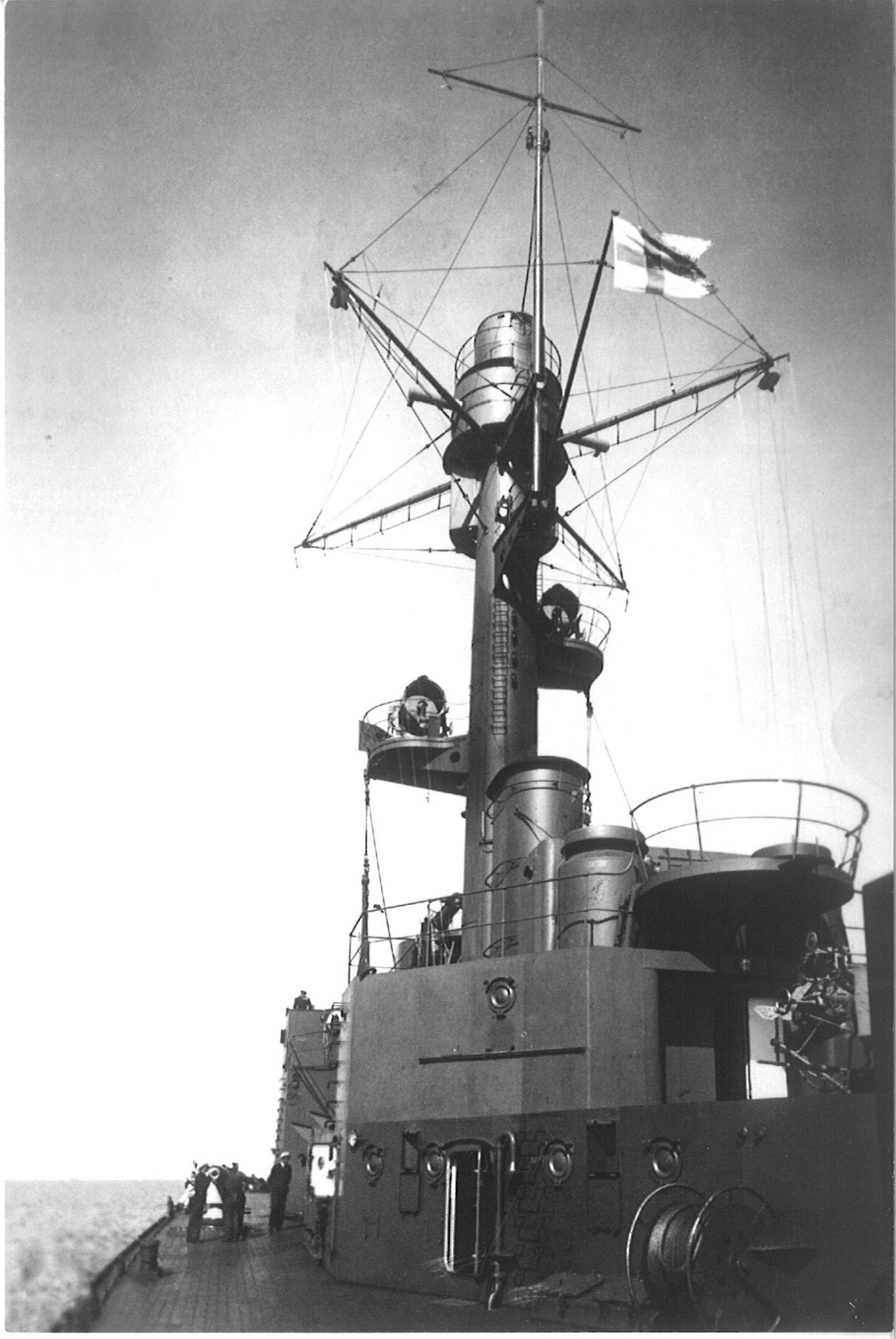 Kuva panssarilaivan kannelta. Etualalla tulenjohtotorni ja sen alapuolella olevia kansirakenteita. Tulenjohtotornin saalingissa liehuu Suomen valtiolippu, tornissa näkyy valonheittimet, tornin taustalla keulatykin rakenteita ja toinen putki, oikealla etualalla pini tykki (Madsen?), vaijerikela ja vasemmalla kannella virkapukuisia henkilöitä., Panssarilaivan kannella
