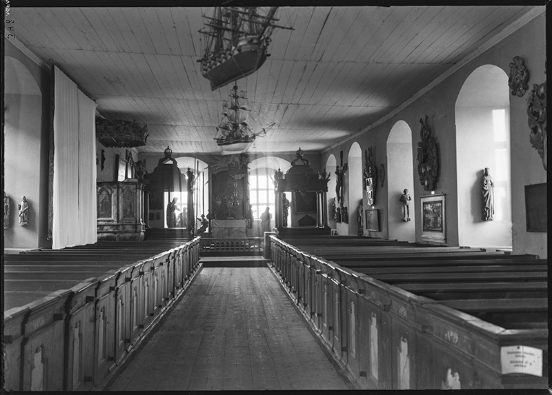 Turun Linnan kirkko, kuva penkkirivien keskeltä alttaria päin. Vasemmalla näkyy saarnatuoli. Oikealla on ikkuna- tai muita koloja seinässä. Niiden välissä on seinään ripustettuja aatelisvaakunoita ja tauluja. Katossa keskikäytävän yllä roikkuu votiivilaivoja., sisäkuva. kirkko. turun linna