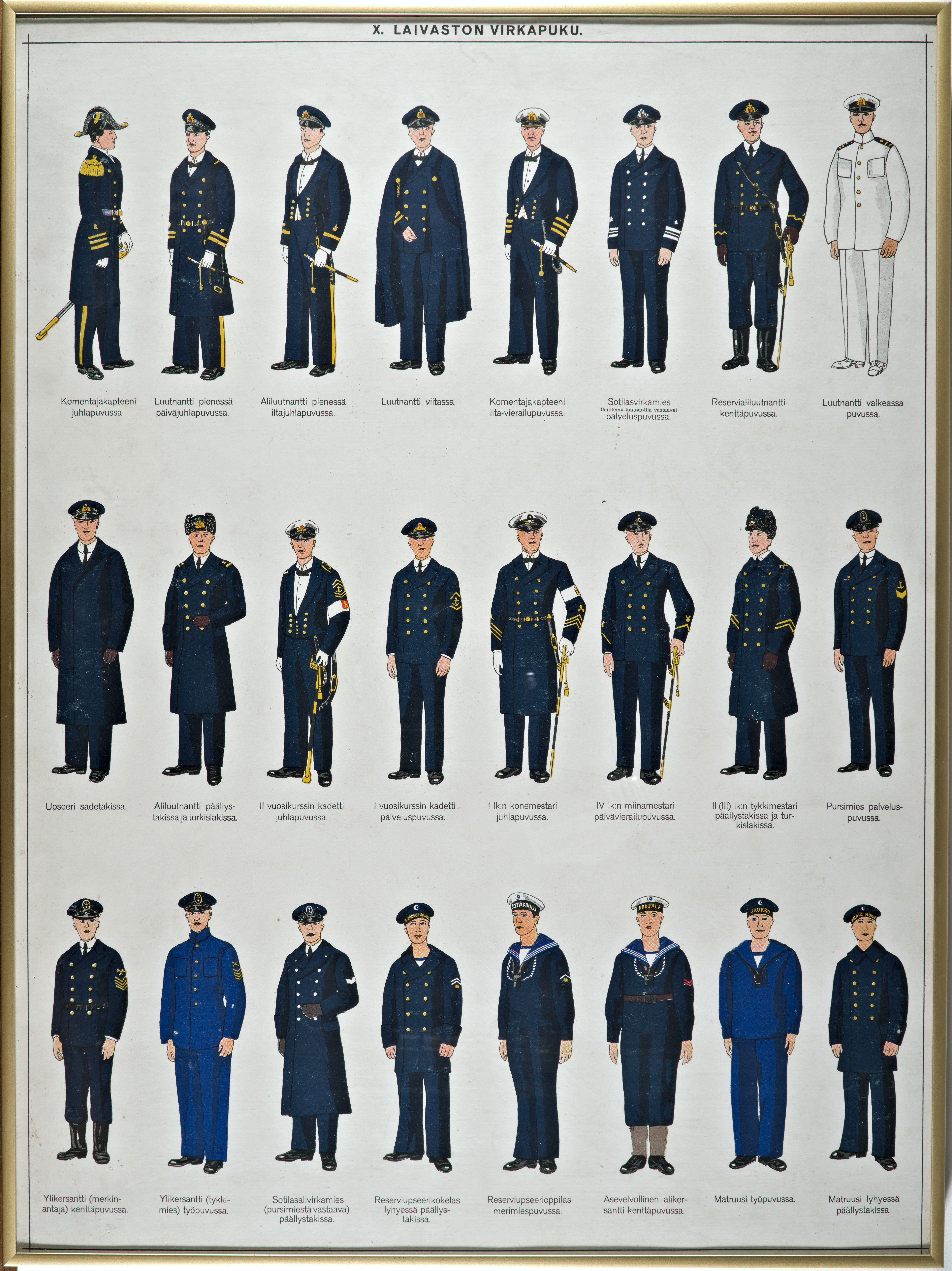 Messinkikehyksinen taulu, jossa kuvataan laivaston virkapukuja. Takana metallinaru. Kuvassa painopiirrettynä 24 eri pukua ja laivaston virkamiestä.