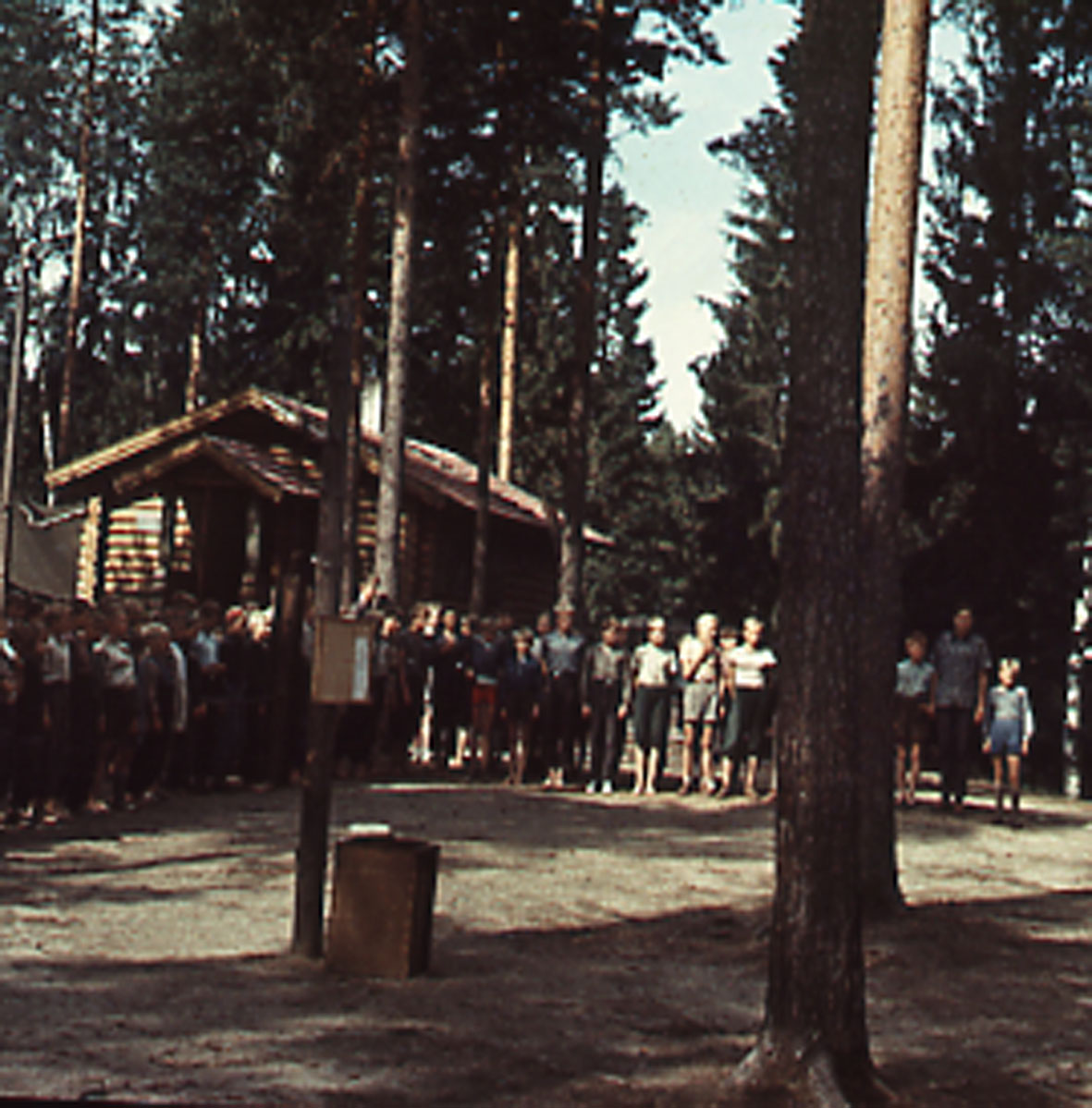 Partaharjun leirikeskus Pieksämäellä. Opetusministeriön lahjoittama 12 kuvan (kuva 10 puuttuu) rainasarja, jonka tekstit tulivat kuvien mukana: ”4. Partaharju on rakennettu suomalaiseen esi-isien tyyliin: hirsirakennukset ovat kuin saloseutujen paalumajoja. Täällä on ”jusseja” ja ”tobiaksia” ja muitakin, joissa kelpaa olla ja eleä.” Värikuvassa iso joukko poika ohjaajineen seisoo kaaressa hirsirakennuksen edustalla. Etualalla ja ympärillä on mäntyjä ja kuusia. Partaharjun Opiston leikekirjassa 1940-luvulta kerrotaan näin: ”Jo ennen sotia etsittiin Suomen pojille pysyvää leirikylän paikkaa. Asia sukelsi uudelleen esille, kun sodan päätyttyä vuonna 1945 vietettiin Pieksämäellä valtakunnallisia poikapäiviä.” Poikien keskus osti Salvosen (Salvonen-järvi) rannalta neljä hehtaaria maata ja leirikylä vihittiin käyttöön vuonna 1945. Seuraavana vuonna aloitettiin Partaharjulla vakituinen leiritoiminta. Tämä rainasarja on kuvattu vuoden 1962 jälkeen, koska kuvissa on jo uusi päärakennus, joka vihittiin käyttöön ko. vuonna.