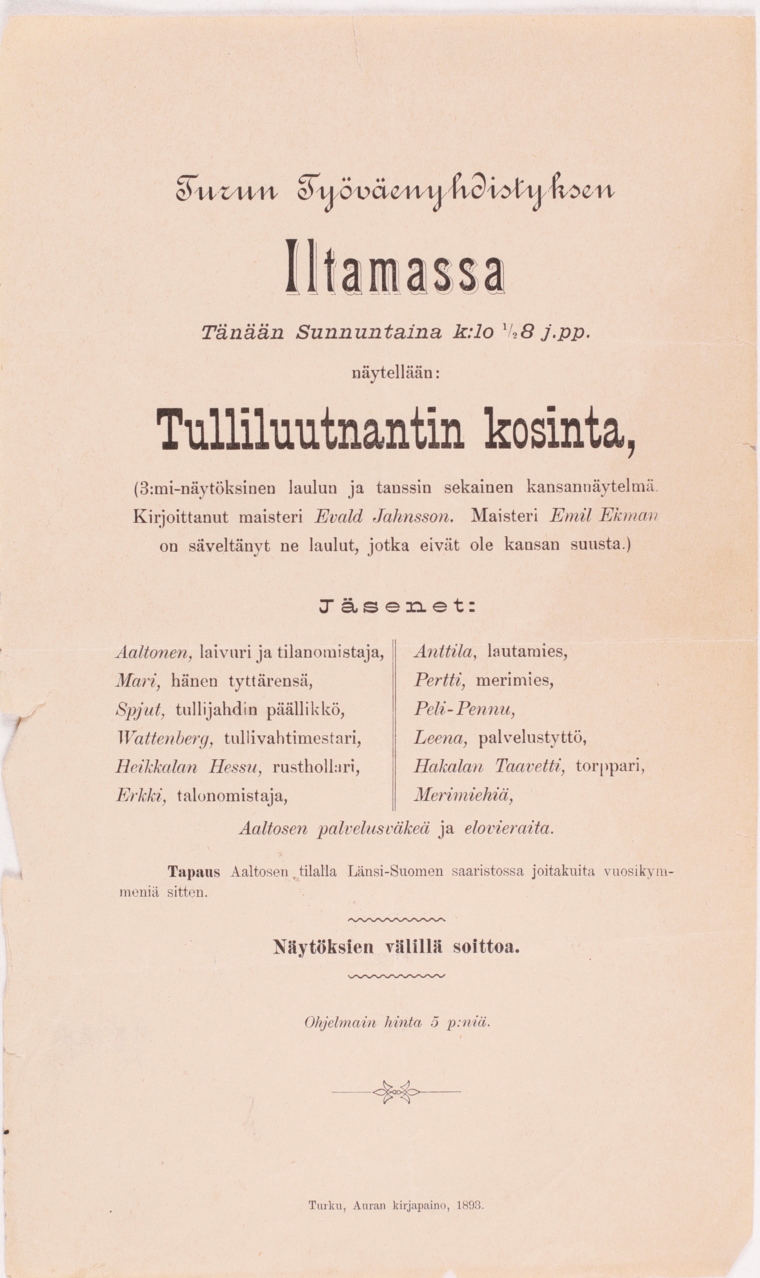 Esite Turun työväenyhdistyksen iltaman "Tulliluutnantin kosinta" -kansannäytelmästä sunnuntaina vuonna 1893. Näytelmän oli kirjoittanut maisteri Evald Jahnsson. Näytelmässä oli ainakin kaksitoista roolia. Näytöksien välillä oli soittoa.